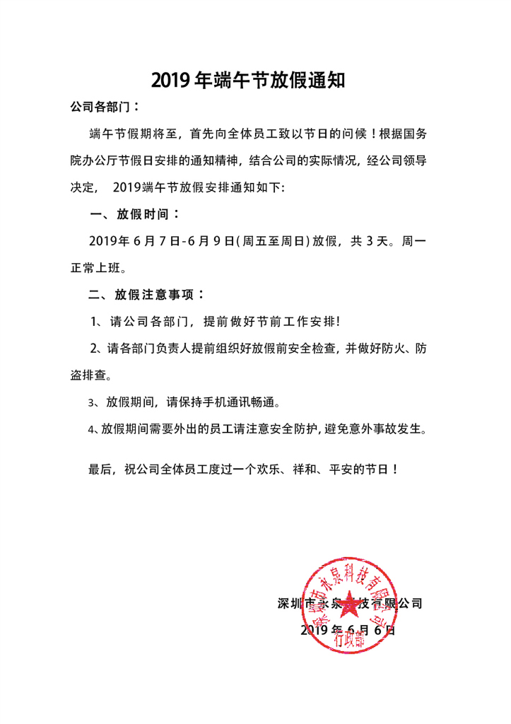 永泉科技2019年端午节放假通知